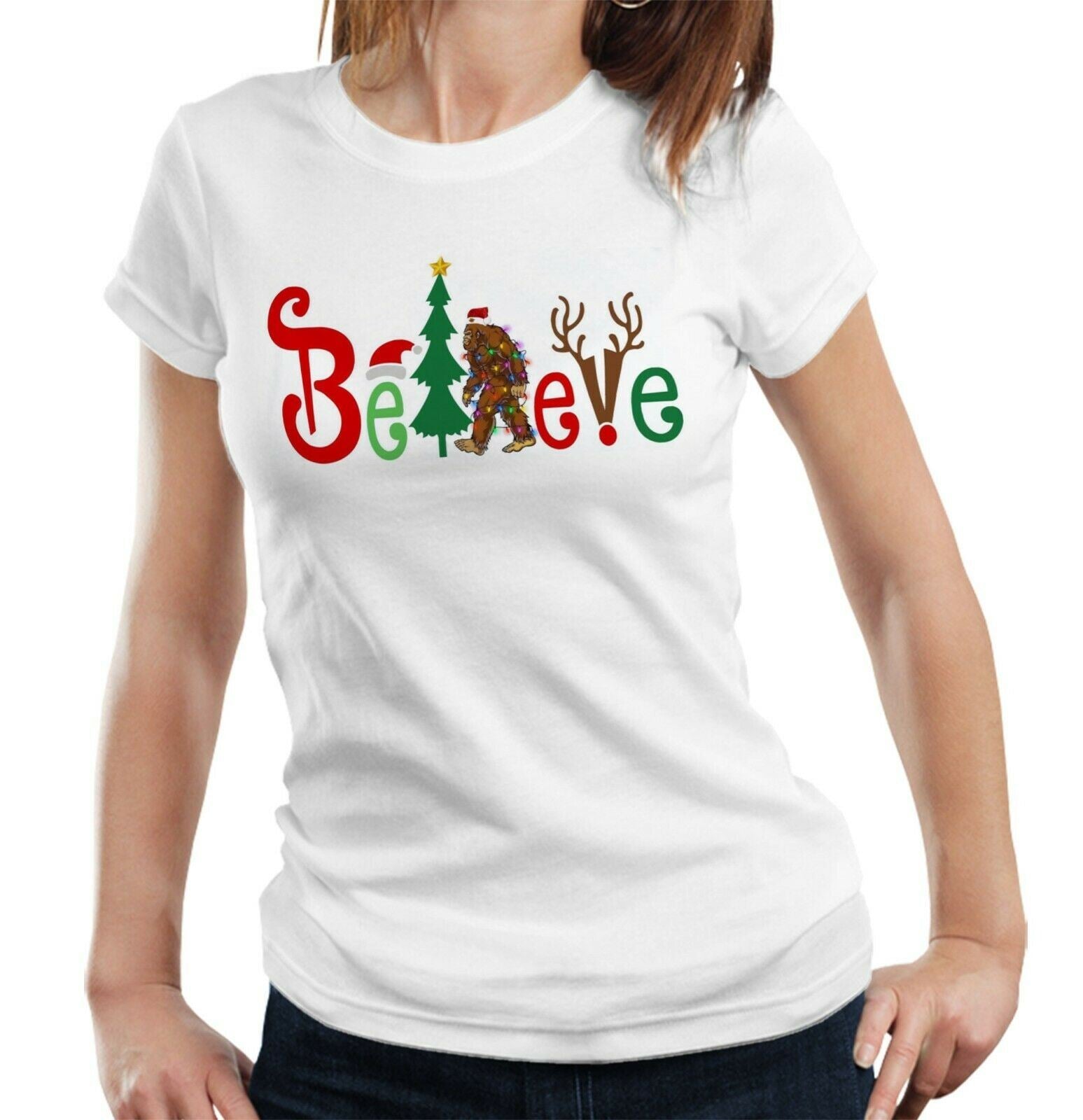 Believe Bigfoot Christmas Tshirt Fitted Ladies