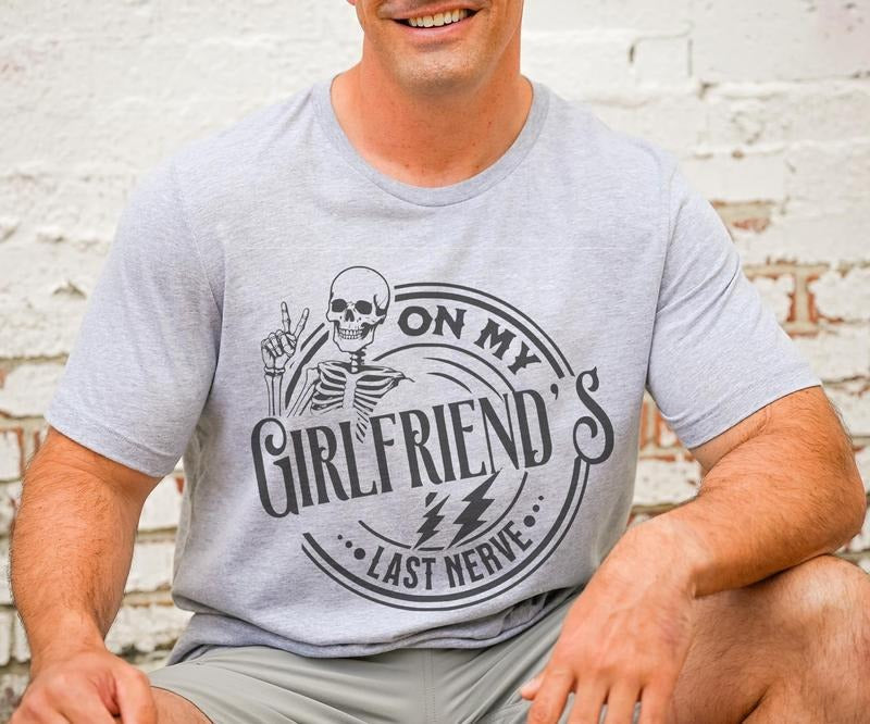 Boyfriend shirt On My Girlfriends Last Nerve T-Shirt Funny Boyfriend Tee Gift For Husband Tshirt Sarcastic Funny Shirt Oversized Fit T-shirt Soft Print Tshirt Comfy Funny Tee Sublimation Print Shirt Casual Shortsleeve Menswear Top