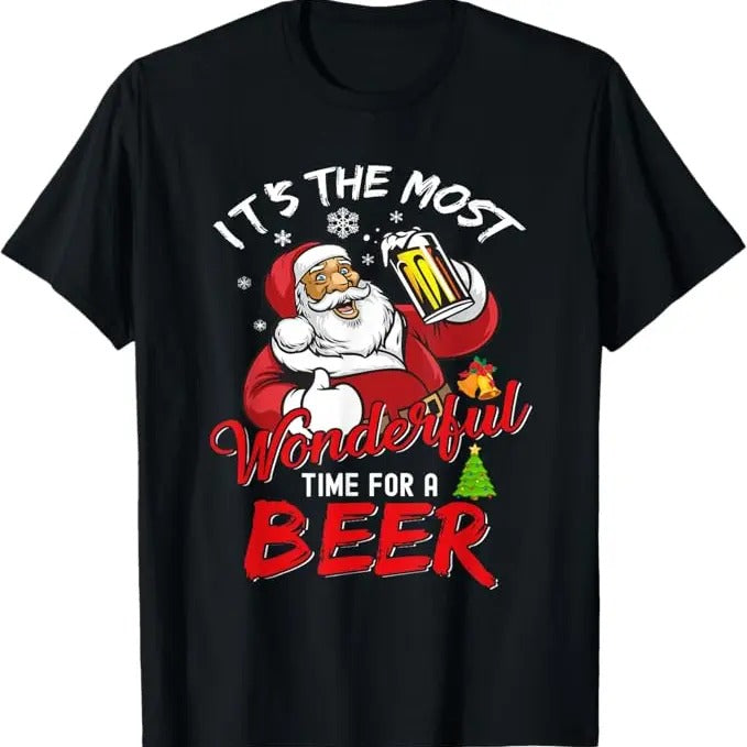 Funny Christmas Shirt, Christmas Gift, Funny Christmas Santa Claus Drinking Beer Wonderful Time T-Shirt - Menswear Top