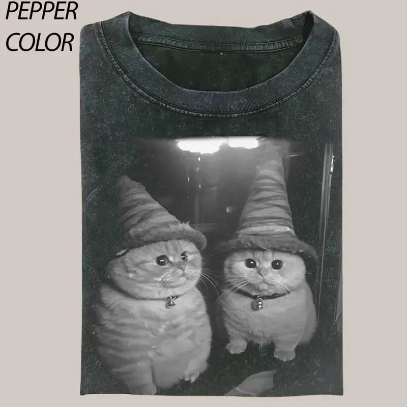 Funny Wizard Cat Vintage Graphic T-shirt, Cute Witch Cat Tee, Cat Lover Unisex T-Shirt, 90's Style Streetwear Graphic Gift For Men Women