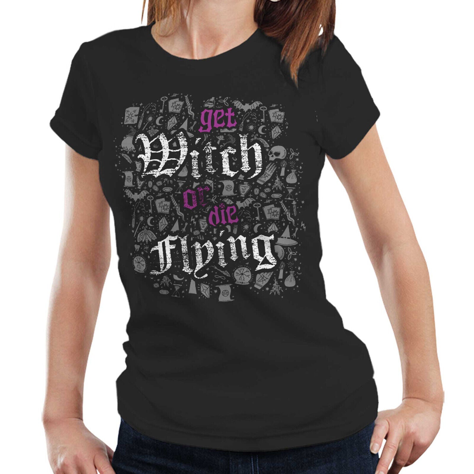 Get Witch Or Die Flying Fitted Ladies Tshirt