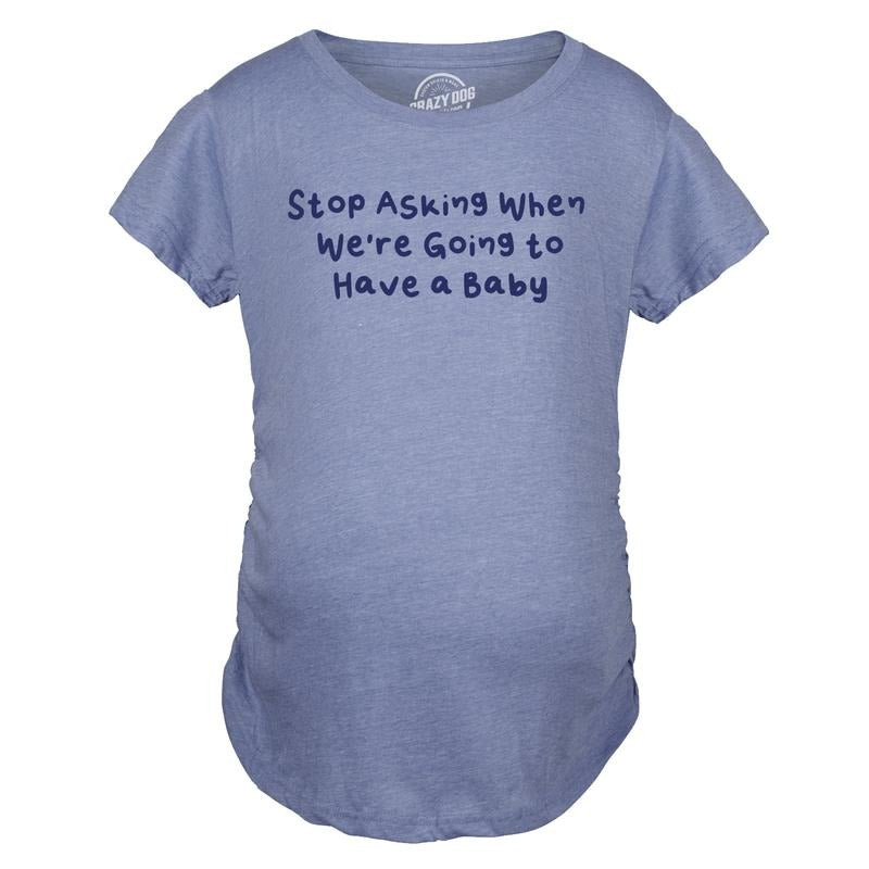 Maternity Stop Asking When Were Going To Have A Baby Pregnancy Tee For Ladies Funny Graphic Maternity Tee Cute Pregnancy Tees With Plus Sizes Funny Sarcastic T Shirt Funny Maternity Shirts Light Blue