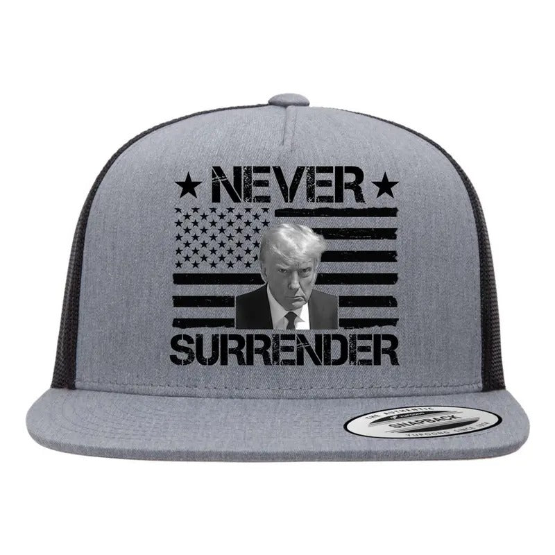 Never Surrender Trump 2024 American Flag Flat Bill Snapback Trucker Hat